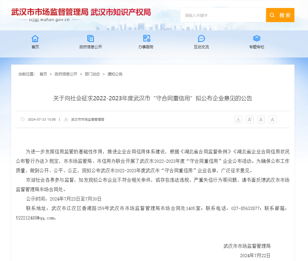 近日,武漢市市場(chǎng)監(jiān)督管理局、市信用辦聯(lián)合開展的“武漢市2022-2023年度‘守合同重信用’”企業(yè)名單已公布,東方華太公司憑借規(guī)范的合同管理體系和良好的社會(huì)信用,成功上榜。